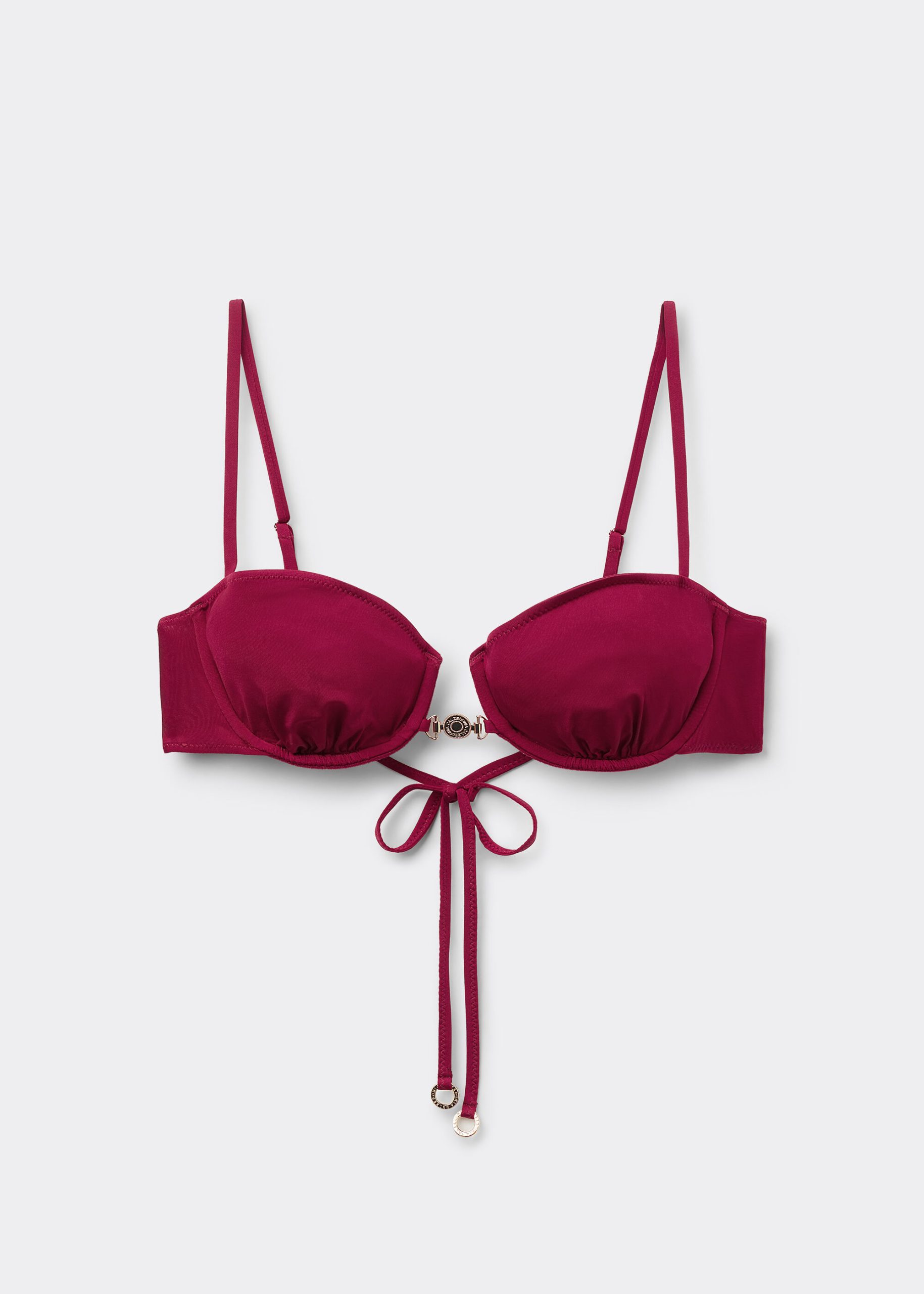 Unpadded balconette swimsuit top with underwire, featuring a minimal fit that exalts the silhouette with a touch of sensuality and refinement. The bright silk-effect fabric embellished by elegant golden details radiates a sophisticated sensation of discrete luxury. Adjustable shoulder straps and string tie fastening complete the design for this summer look that does not pass by unnoticed.