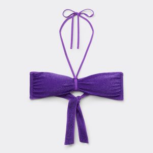 Wireless bandeau bikini top with removable padding, made in stylish shiny lamé fabric that provides a luminous and sophisticated effect. The side boning offers better support while the removable central strap lets you vary the top’s style and fit. Back tie closure.