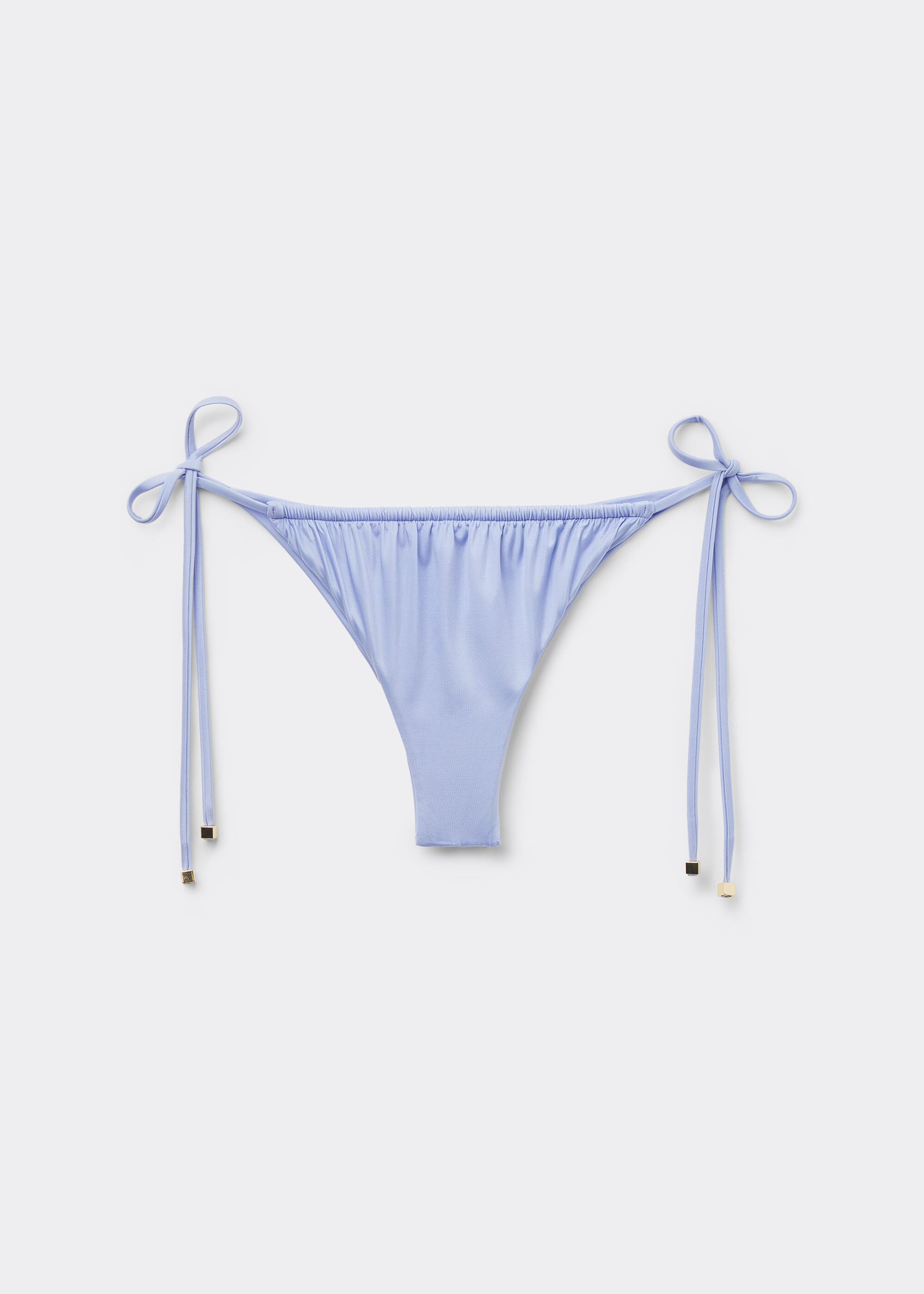 Brazilian cut bikini bottom with side ties to adjust the fit. The style features a bright fabric with a silky effect, embellished by ruffles and gold tips. Fully lined with invisible seams.