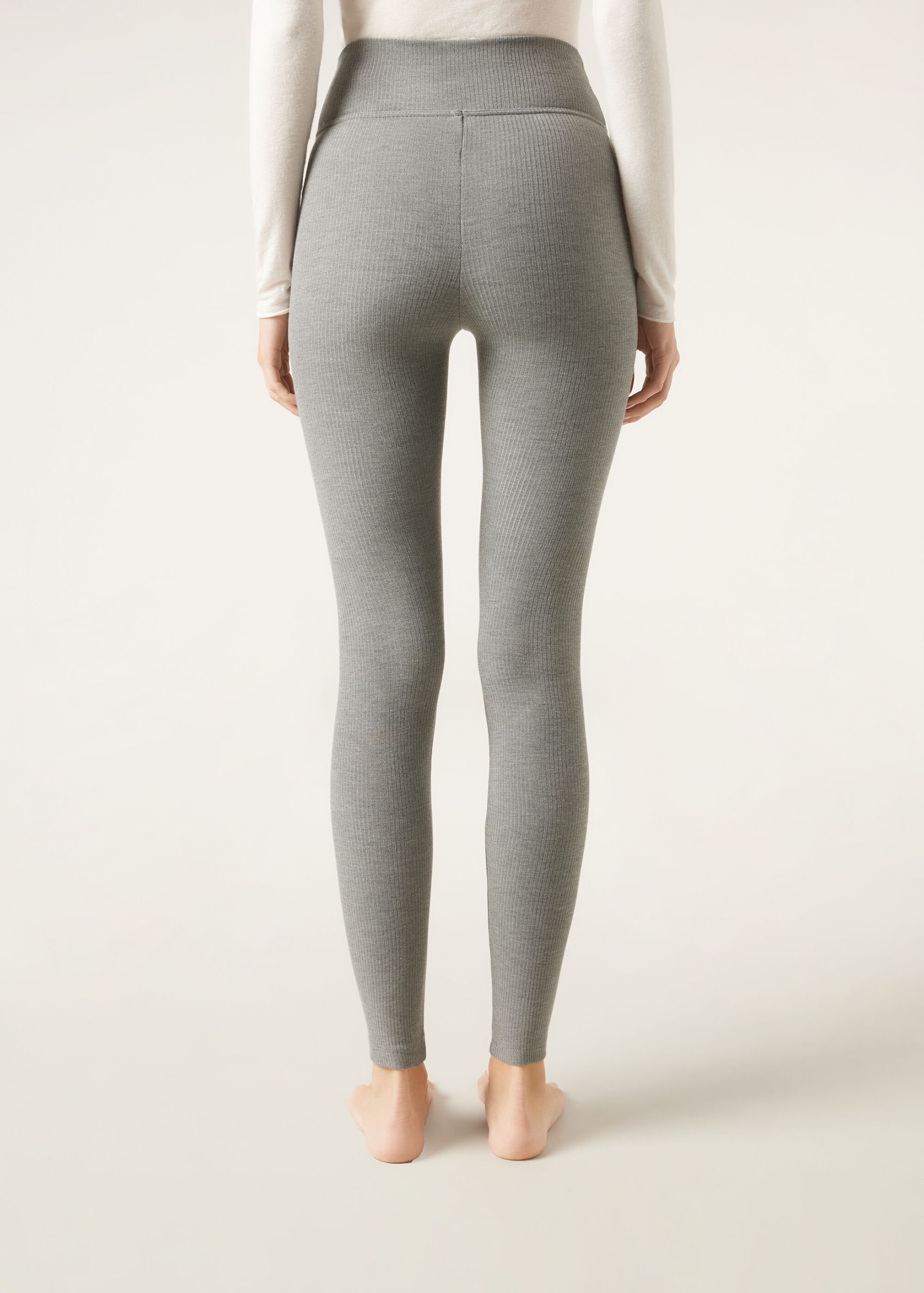 Women’s ribbed cashmere blend modal leggings featuring a comfortable high waist with soft elastic. The fabric is opaque, soft, and breathable, with a brushed interior for a warm and comfortable effect, ideal on the coldest days.