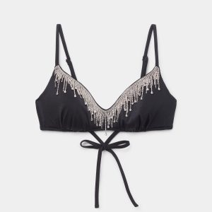 Wireless sleeveless top with light internal padding. The side stays help support the bust. Adjustable shoulder straps and slender lace fastening at the back. Shine in style in this exclusive top embellished with a cascade of crystals and silver gemstones. The perfect top to pair with your glamorous evening outfits. PLEASE NOTE: this garment has been hand embellished. Each garment is unique. Due to the delicate nature of this garment, please take care when washing.