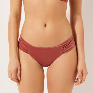 Brazilian bikini bottom with draped fabric at the sides that allow the height to be adjusted. The style features a particularly soft, shiny, silky-effect fabric. Fully lined and with invisible seams.