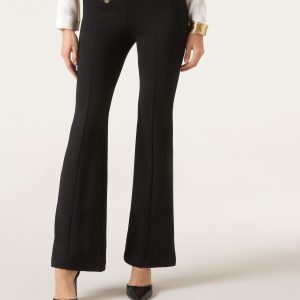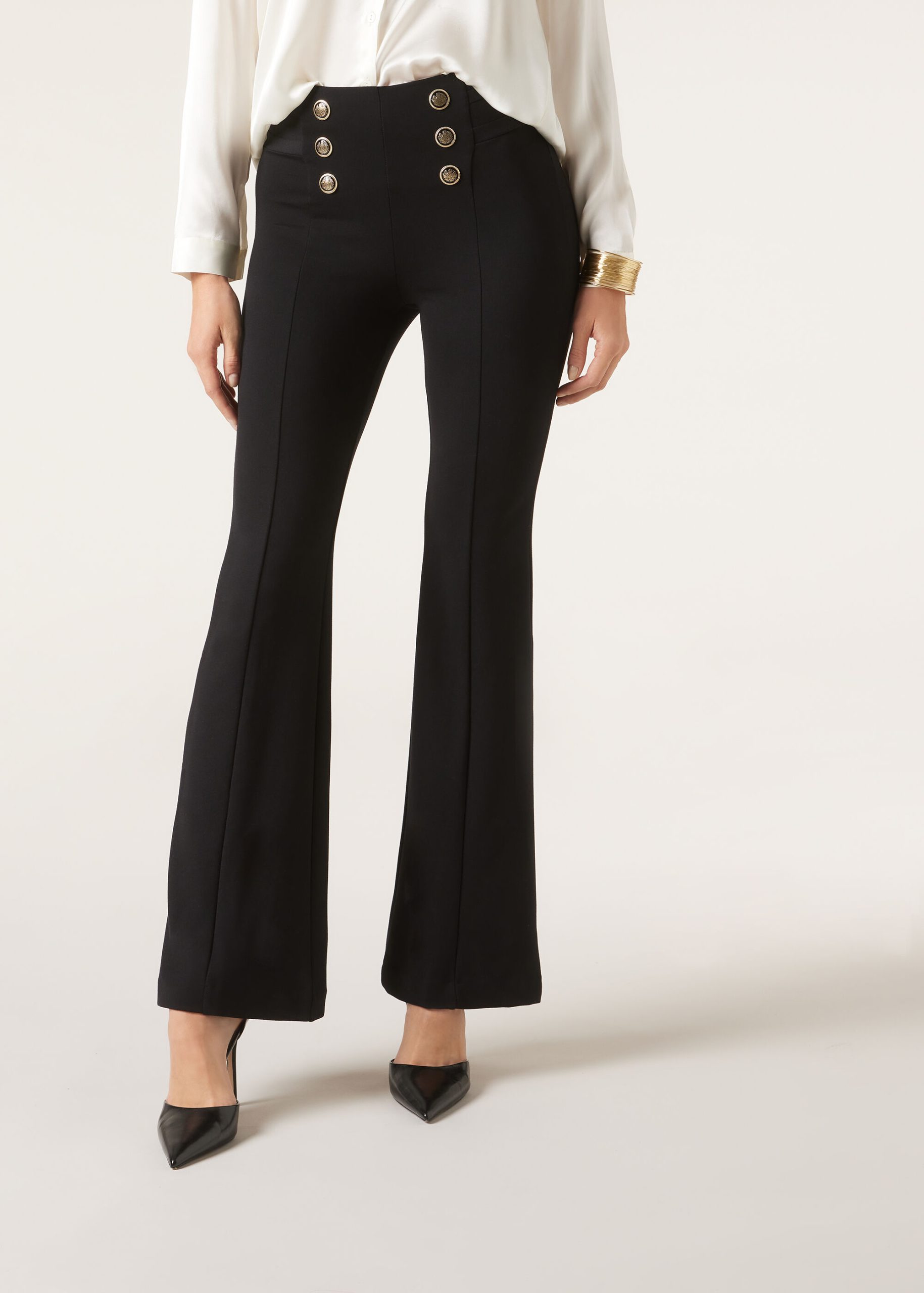 Women’s bell-bottom flared jeans, inspired by the classic sailor pant design, made of soft and comfortable punto milano fabric. The decorative gold buttons on the flared pants add a touch of refinement, while the central seam provides structure and defines the piece.