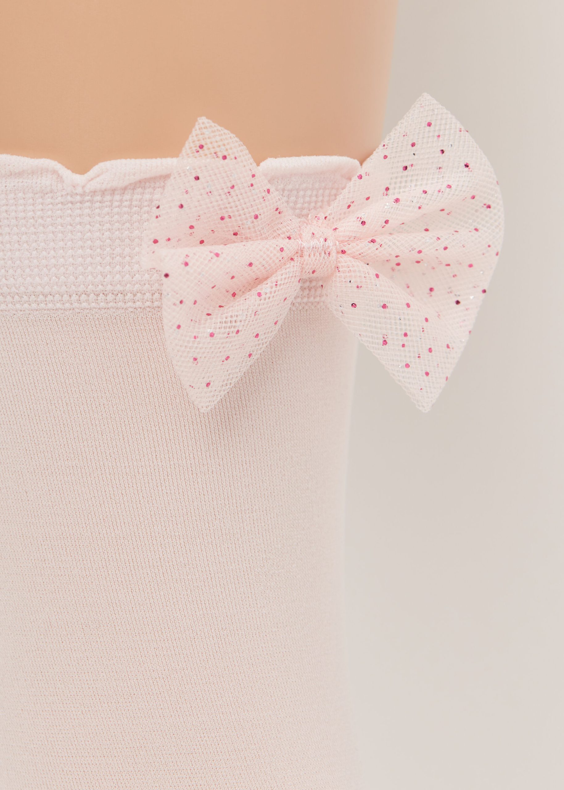Girls’ 30 denier microfiber short socks with elegant tulle bow with glitter appliqué, trimmed with a scalloped edge.