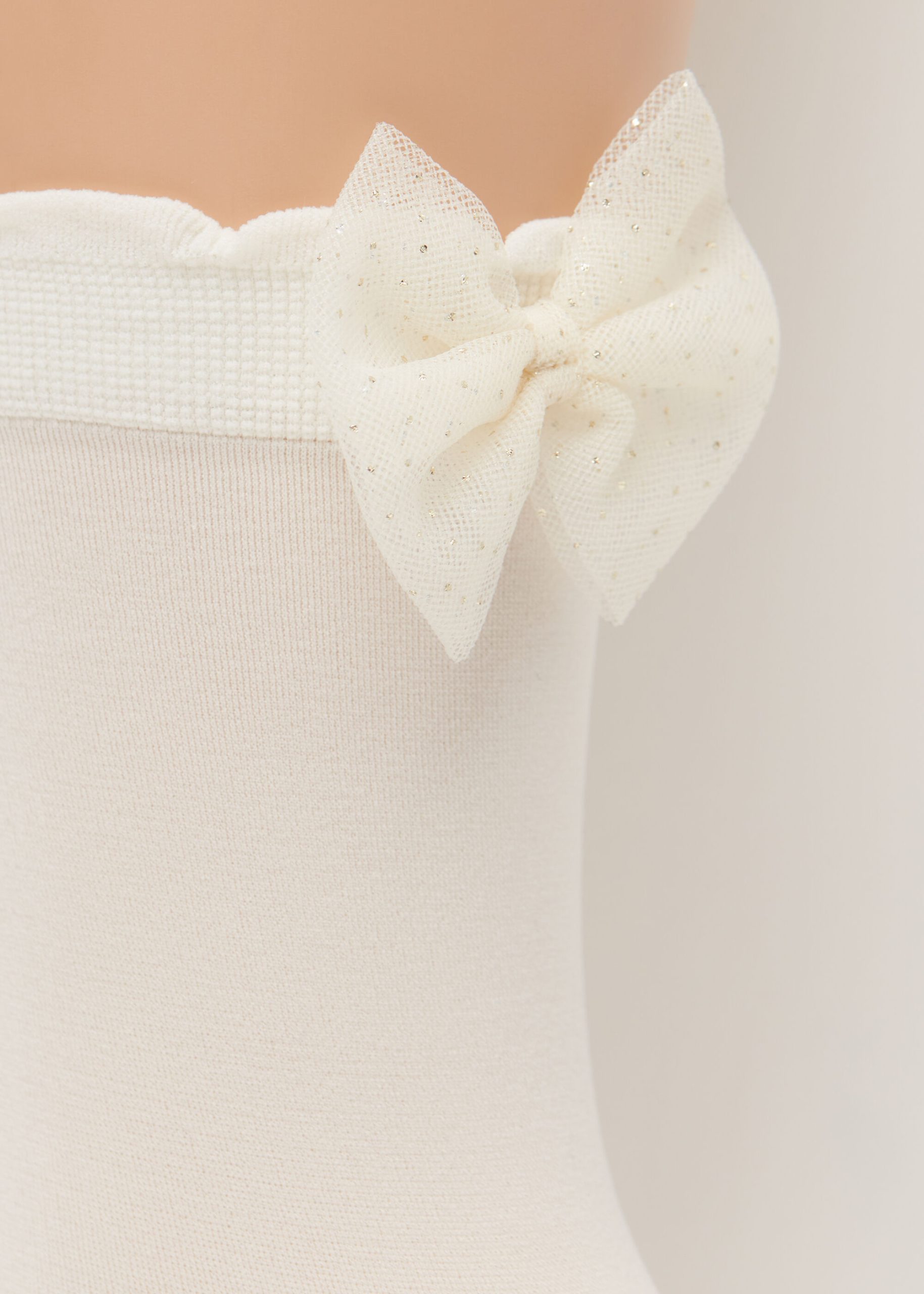 Girls’ 30 denier microfiber short socks with elegant tulle bow with glitter appliqué, trimmed with a scalloped edge.