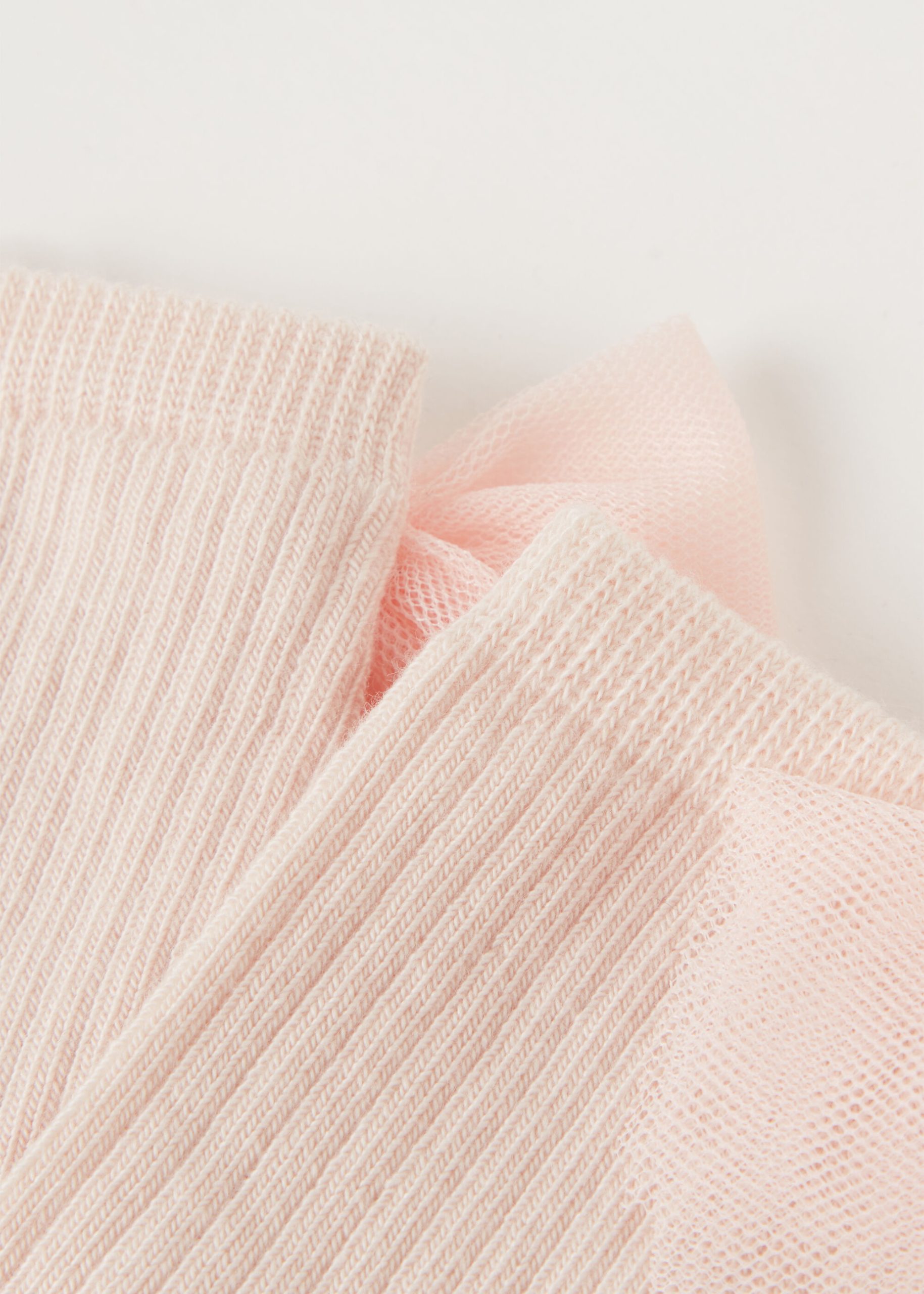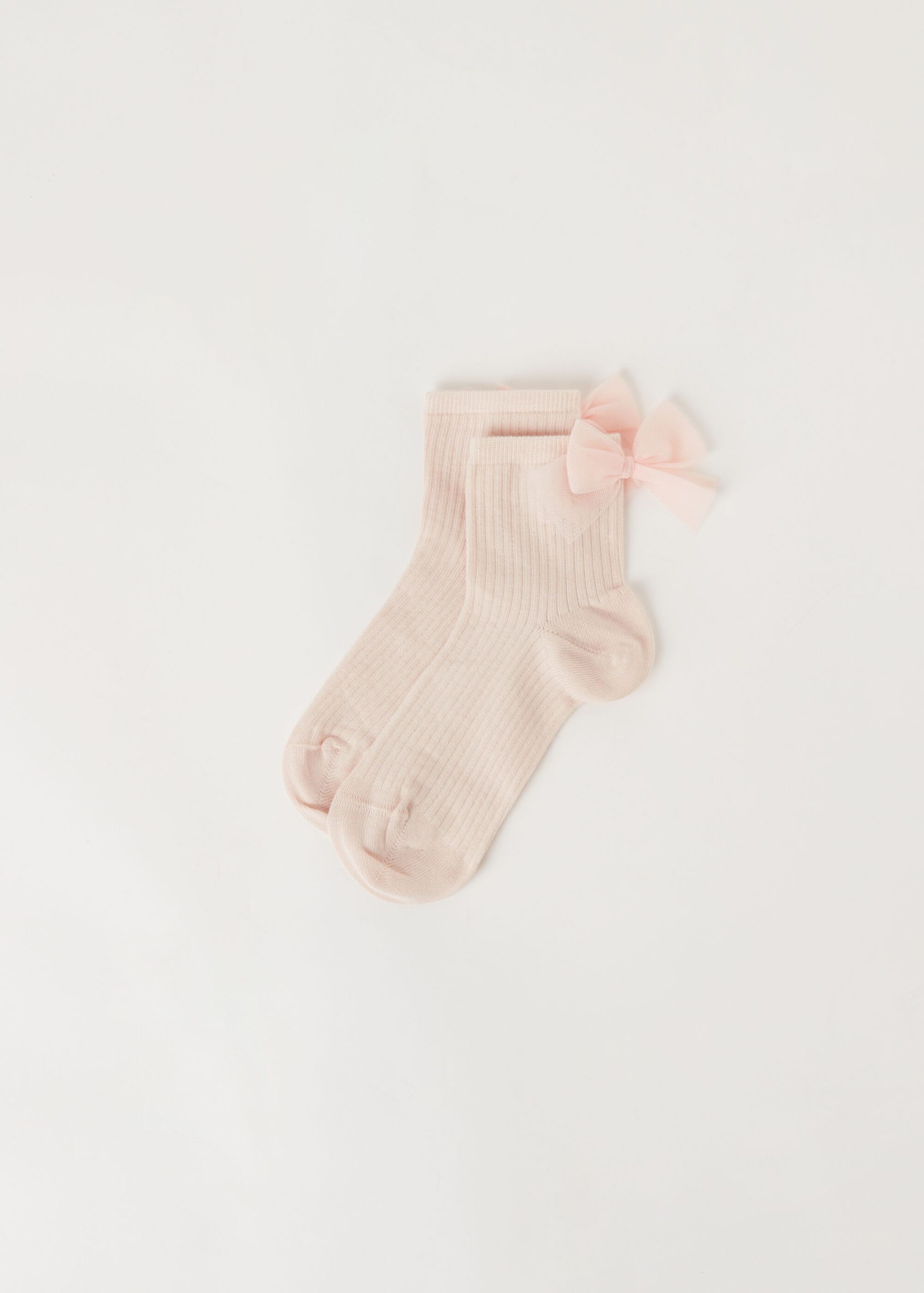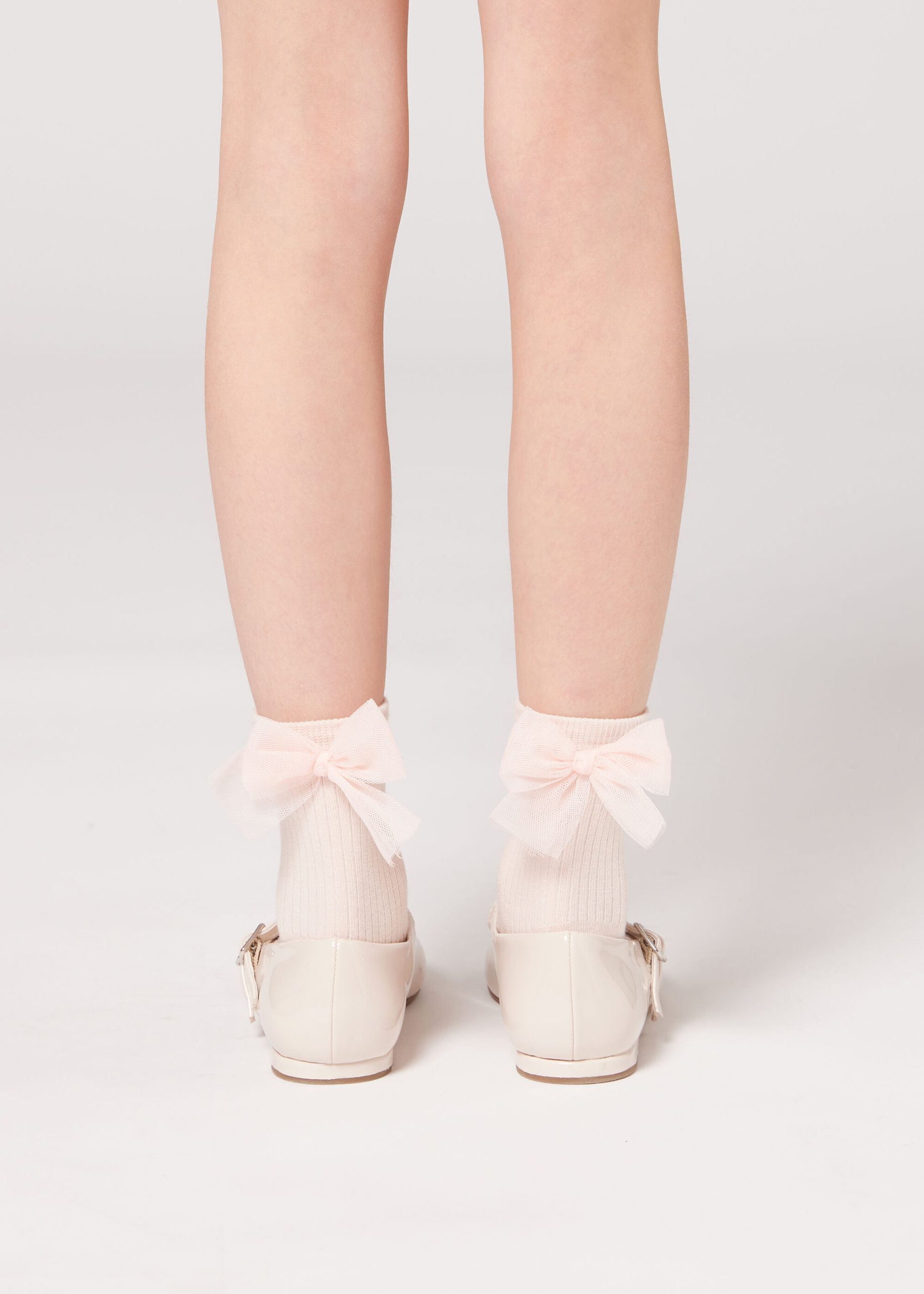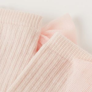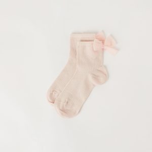 Girls’ short soft cotton socks featuring a ribbed construction and an elegant bow appliqué.