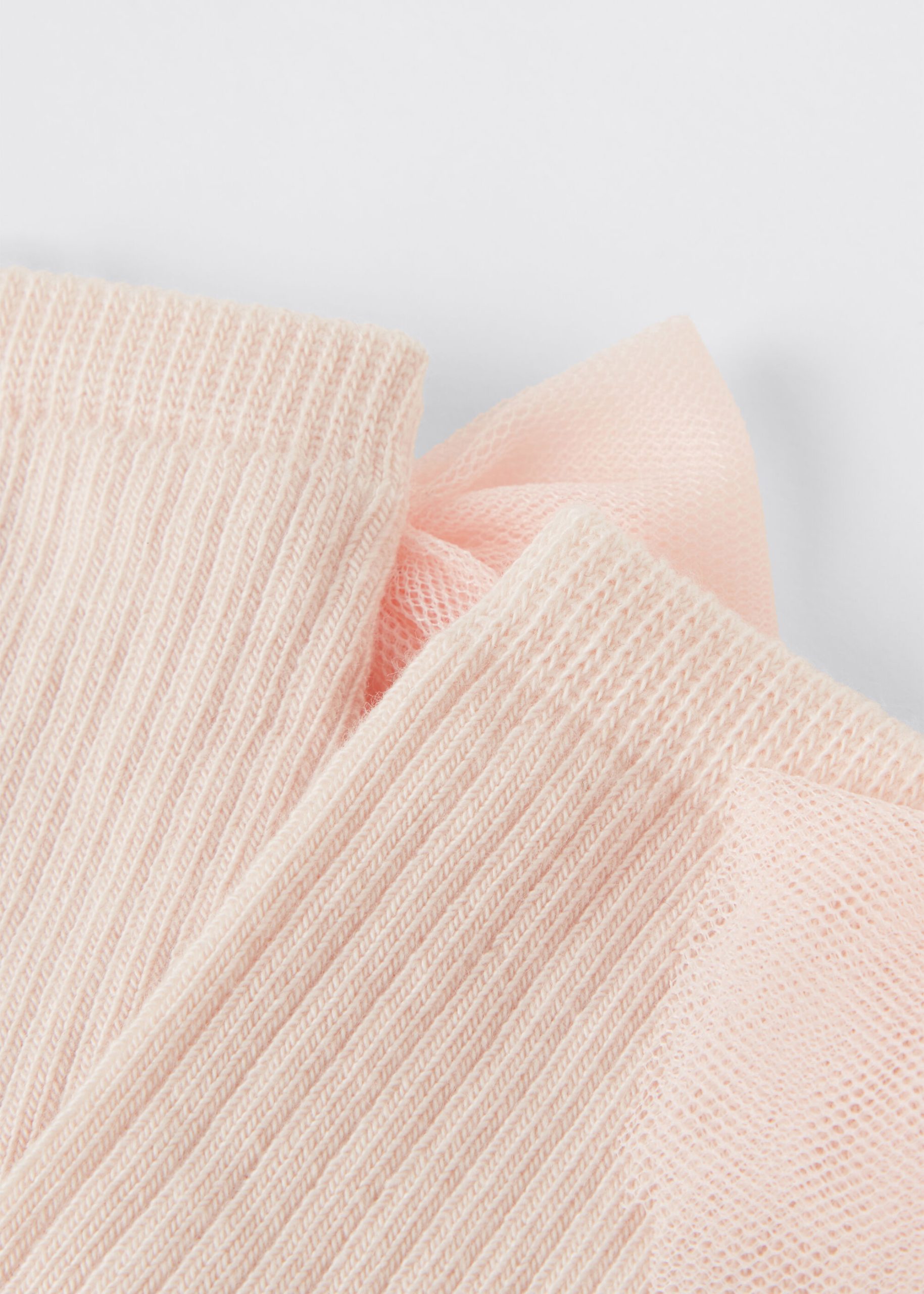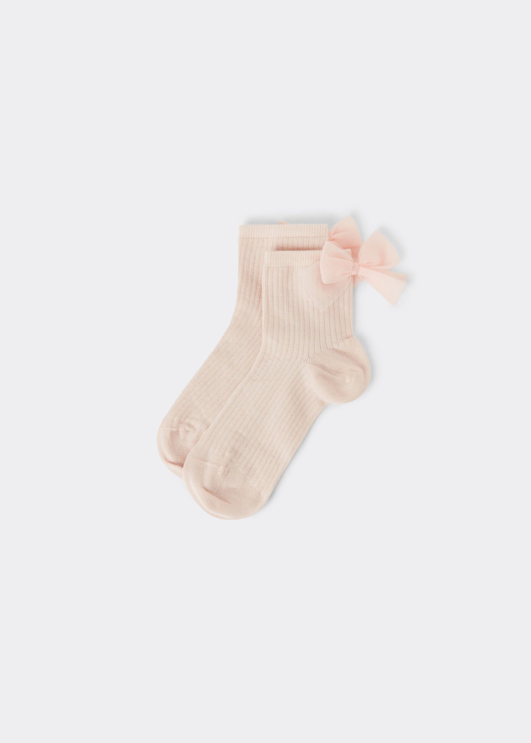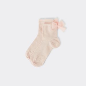 Girls’ short soft cotton socks featuring a ribbed construction and an elegant bow appliqué.