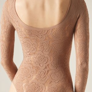 Floral motif mesh bodysuit with macramé effect to pair with coordinating tights MODC2150. It features a boat neckline and long sleeves and provides an elegant and sophisticated look. The hook closure for the bottom guarantees practicality and comfort. Ideal for chic outfits and special occasions.