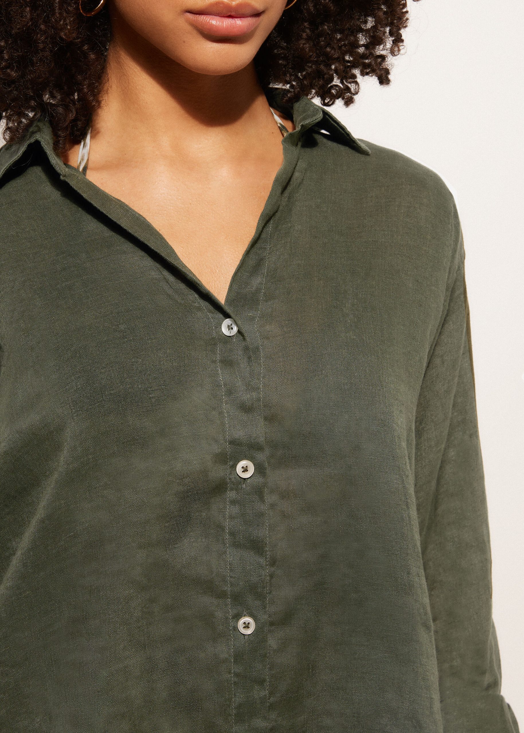 Button up shirtdress in linen for those who love natural fibers, with lapel collar and long sleeves. Above-the-knee length.