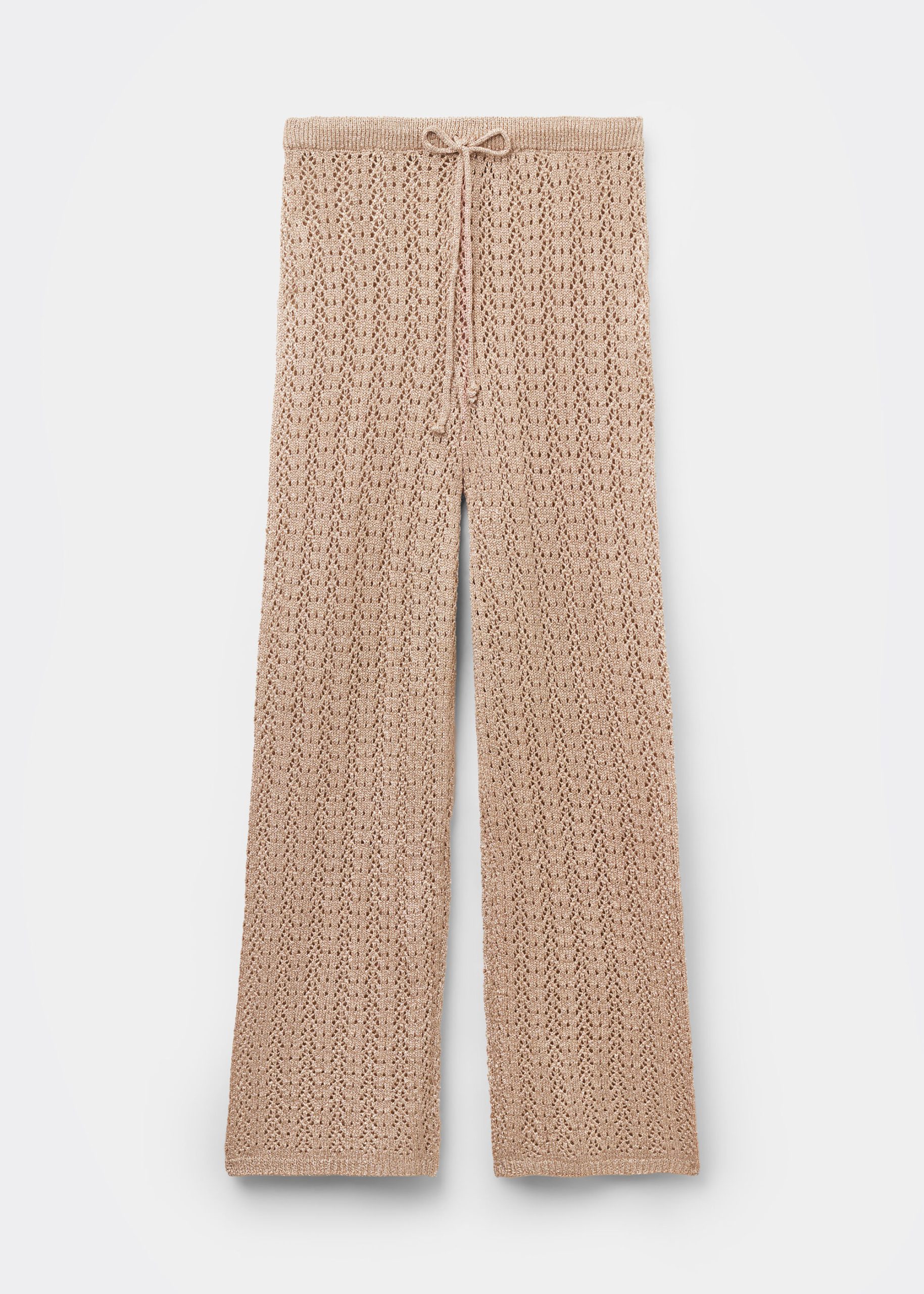 Long crocheted golden lamè pants with drawstring at the waist, perfect to wear on top of beachwear or for special chic appeal occasions. Elegant and versatile, they offer a relaxed fit and a note of brightness due to the lamè yarn.