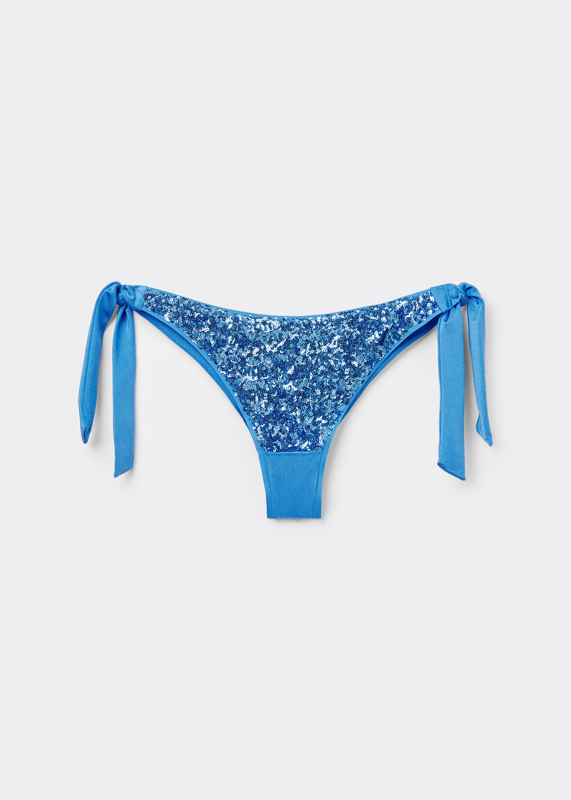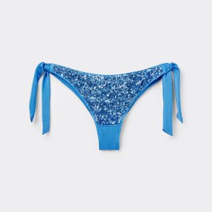 Brazilian bikini bottoms with side tie closure to adjust the fit. The slightly rounded waist at the front allows for both a regular and more high-cut fit, depending on one’s physique. The shiny microfiber fabric is embellished with elegant sequins. Invisible seams. Back with central seam that ensures a better fit.