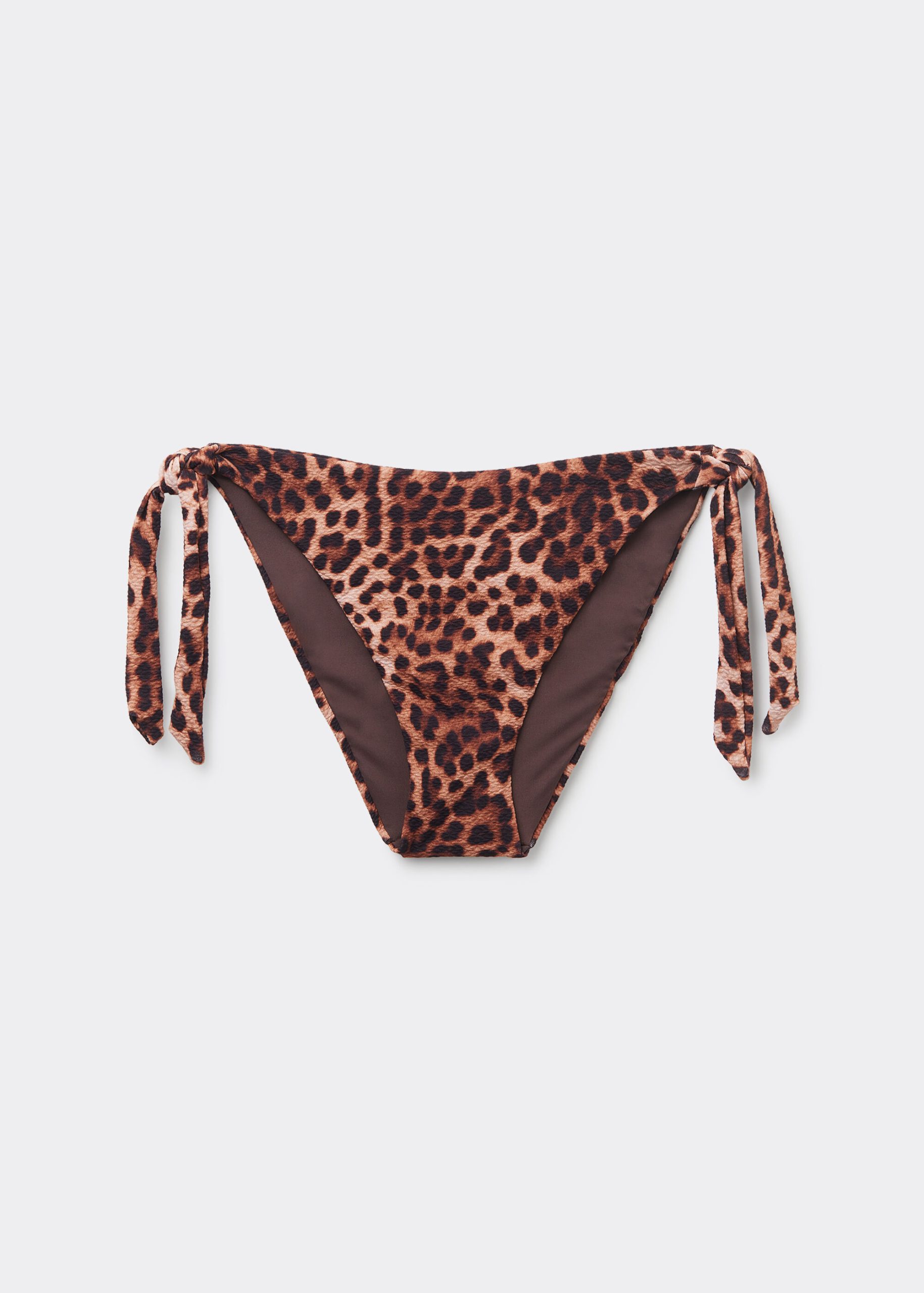 Bikini bottom with side tie closure to adjust the fit. The slightly rounded waist at the front allows for both a classic or more high-cut fit, depending on one’s physique. The style features an elegant animal pattern and lightly ruched fabric. Fully lined and with invisible seams.