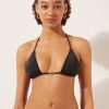 String bikini bottoms with side ties to adjust the fit. The slightly rounded waist at the front allows for both a regular and more high-cut fit, depending on one’s physique. It features a minimal fit that exalts the silhouette with a touch of sensuality and refinement. The bright silk-effect fabric embellished by elegant golden details radiates a sophisticated sensation of discrete luxury.