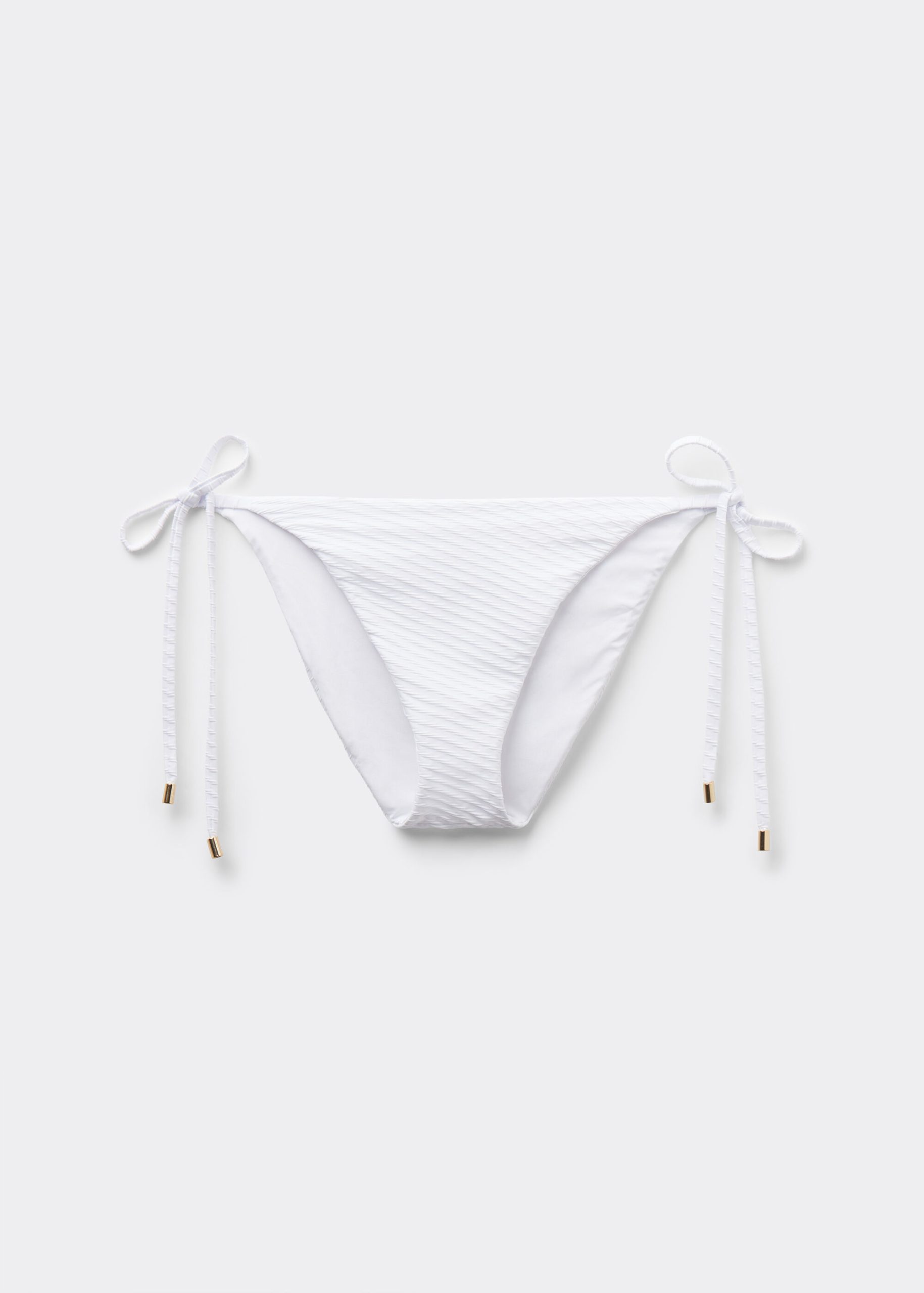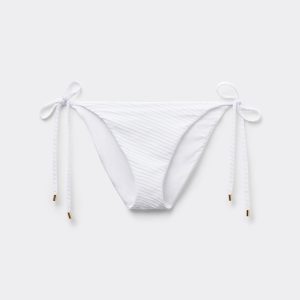 Bikini bottoms with side ties to adjust the fit, embellished with silver tips. The slightly rounded waist at the front allows for both a regular and more high-cut fit, depending on one’s physique. The style features a particularly soft three-dimensional diagonal-motif fabric. Fully lined with invisible seams.