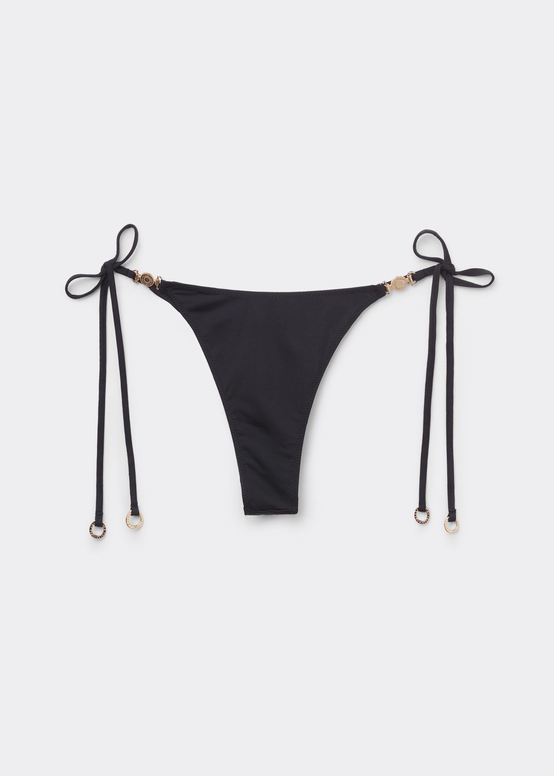 Thong bikini bottoms with side string ties to adjust the fit. It features a minimal fit that exalts the silhouette with a touch of sensuality and refinement. The slightly rounded waist at the front allows for both a regular and more high-cut fit, depending on one’s physique. The bright silk-effect fabric embellished by elegant golden details radiates a sophisticated sensation of discrete luxury. Fully lined with invisible seams.