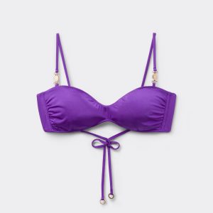 Tank style bikini top, wireless and unpadded for a natural effect. It features a minimal fit that exalts the silhouette with a touch of sensuality and refinement. The bright silk-effect fabric embellished by elegant golden details radiates a sophisticated sensation of discrete luxury. Adjustable shoulder straps and string tie fastening complete the design for this summer look that does not pass by unnoticed.