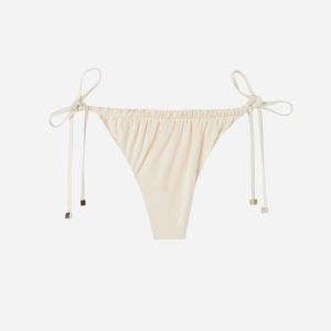 Thong bikini bottoms with adjustable thin sides. The slightly rounded front allows for wearing it either as normal or with the legs higher on the sides to show off the physique. Fully lined with invisible seams.