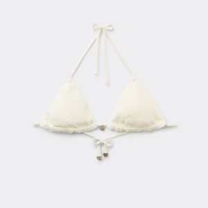 Slide triangle bikini top with removable padding, wireless for a natural effect. The refined and sophisticated crochet fabric is enriched by a small medal on the center front gore that exalts its elegance. The shoulder straps have eyelets on the ends so they can be hooked onto the back band or tied behind the neck. Back string tie closure.