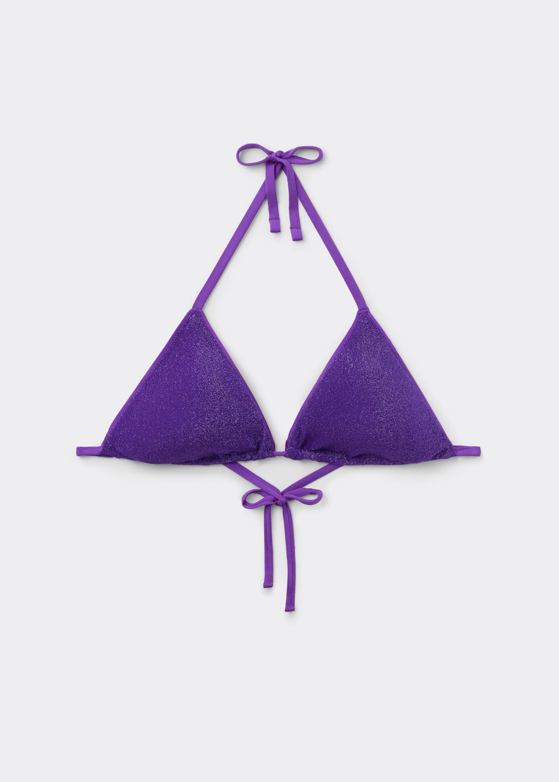 Slide triangle bikini top with removable padding, wireless for a natural effect. Made in stylish shiny lamé fabric that provides a luminous and sophisticated effect. The shoulder straps have eyelets on the ends so they can be hooked onto the back band or tied around the neck. Back string tie closure.