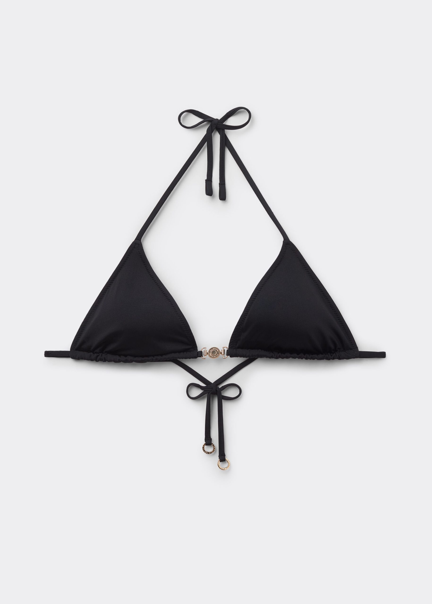 Slide triangle style bikini top with removable padding, wireless, featuring a minimal fit that exalts the silhouette with a touch of sensuality and refinement. The bright silk-effect fabric embellished by elegant golden details radiates a sophisticated sensation of discrete luxury. The straps have an eyelet at the end to insert them on the underband or fasten behind the neck, while the string tie fastening on the back guarantees an adjustable fit. Perfect for a sophisticated and irresistible summer look.