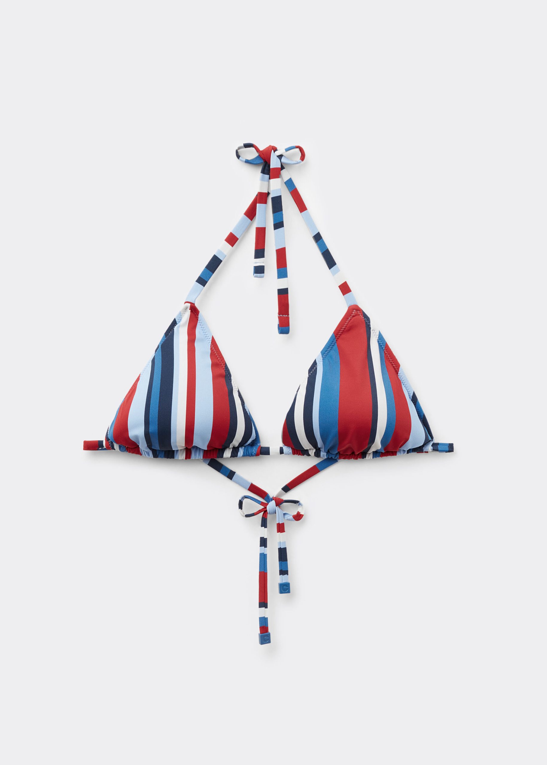 Slide triangle bikini top with removable padding, wireless for a natural effect. Made from soft microfiber, the top is embellished with a vibrant multi-colored striped pattern, which adds a touch of freshness and color to the look. The shoulder straps have eyelets on the ends so they can be hooked onto the back band or tied around the neck. Back string tie closure.